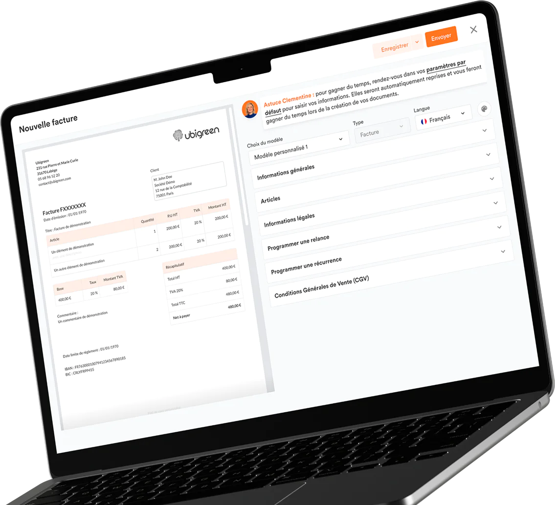 Plus besoin de logiciel compliqué ou de paperasse. Clementine propose un logiciel de facturation gratuit qui vous permet de créer, envoyer et suivre vos factures en ligne, depuis n’importe quel appareil. Gagnez du temps avec une solution simple, rapide et 100 % en ligne.